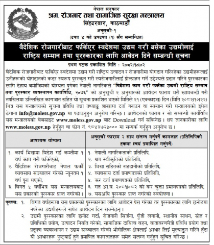 वैदेशिक रोजगारीबाट फर्किएर स्वदेशमा उद्यम गरी बसेका उद्यमीलाई राष्ट्रिय सम्मान तथा पुरस्कार लागि आवेदन दिने सम्बन्धमा ।