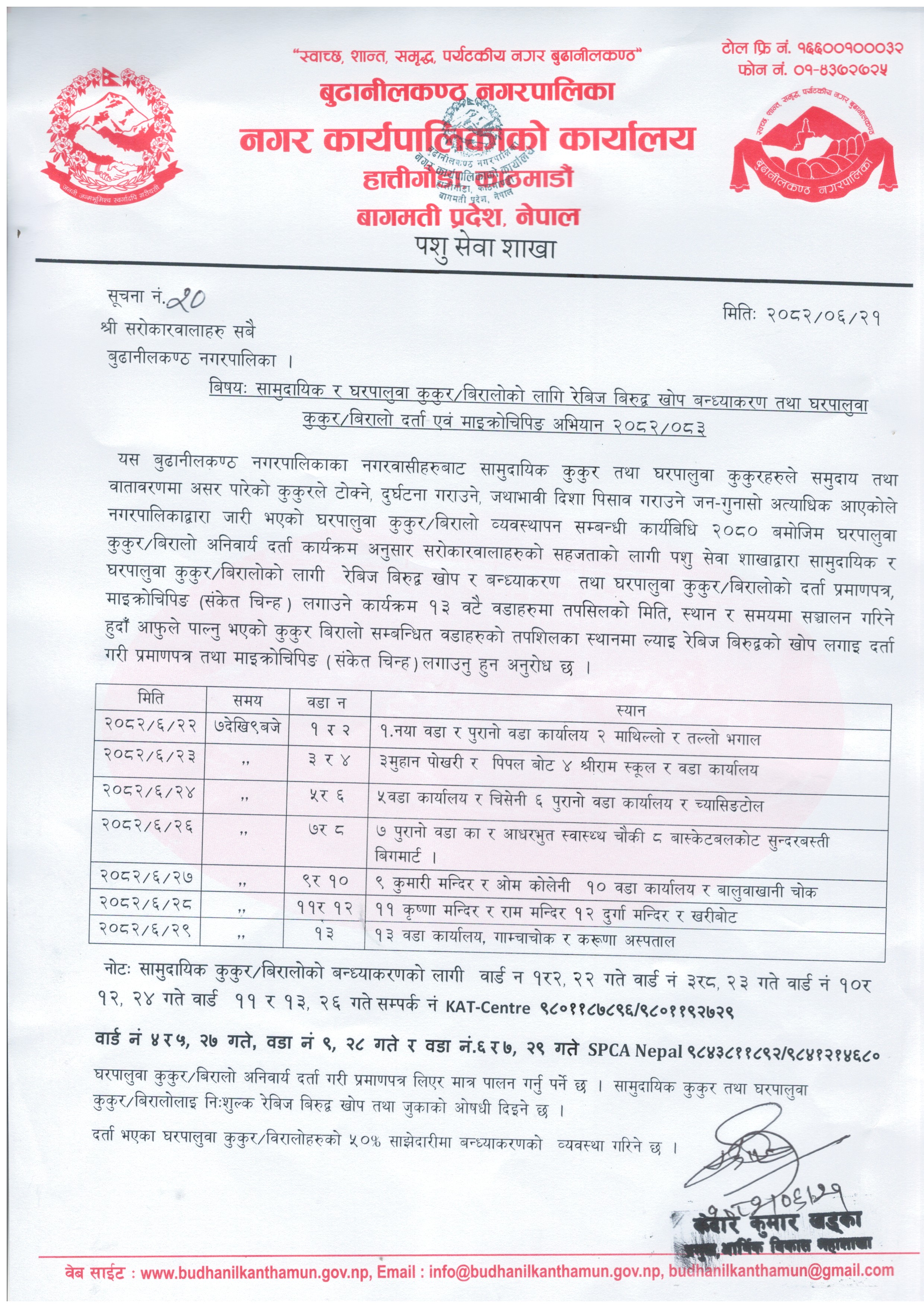 सामुदायिक र घरपालुवा कुकुर/बिरालोको लागि रेबिज विरुद्ध खोप बन्ध्याकरण तथा घरपालुवा कुकुर/बिरालो दर्ता एवं माइक्रोचिपिङ अभियान २०८२/०८३