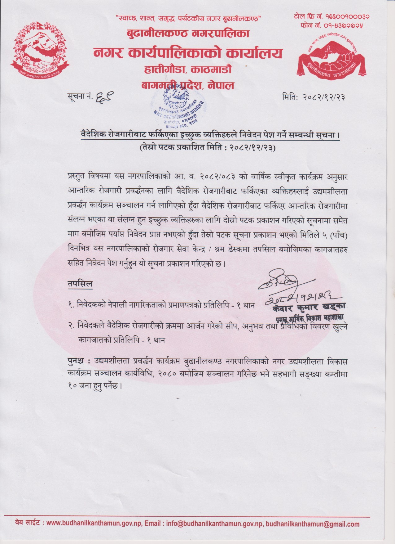 वैदेशिक रोजगारीबाट फर्किएका इच्छुक व्यक्तिहरुले निवेदन पेश गर्ने सम्बन्धी सूचना।